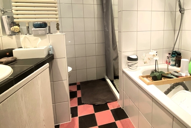 Unten der offene Küchen- Ess Bereich mit integrierter Einbauküche. Neben dem Eingang befindet sich zudem ein separates WC mit Waschmaschinenanschluss.